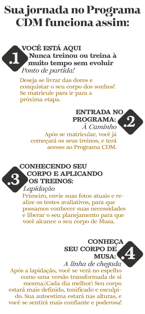 ➜ O CDM é um programa de treinos 100% personalizados, criado com base no seu corpo, seus objetivos e suas limitações. Ele foi desenvolvido para mulheres que querem sair do ciclo de frustração na academia, evoluir de verdade e conquistar o corpo dos sonhos com suporte, planejamento e acompanhamento de perto.